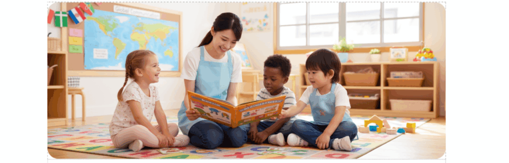 世界の物語の読み聞かせ。一日の振り返りや翌日の目標を英語で確認します。